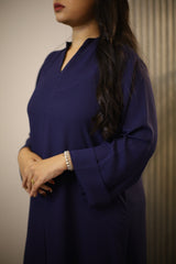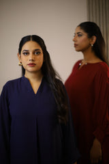 Designed in flowy Georgette, this long A-line tunic dress features a relaxed silhouette with a center inverted box pleat for added structure. The flat band neckline with a subtle V-cut and three-quarter folded sleeves complete the look with refined simplicity.