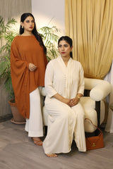 Rust Kaftan Tunic crafted in fluid crepe, this short tunic features a contemporary kaftan-inspired silhouette with an asymmetric twist. One side offers a fitted sleeve for structure, while the other drapes gracefully in a relaxed kaftan style, creating a striking and modern statement look.