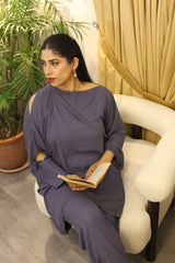 In a refined bluish-grey tone, this Georgette co-ord set features a straight-cut neckline and batwing sleeves with subtle slit detailing. The high-low tunic adds graceful movement, perfectly paired with flared flapper pants for a sleek, contemporary look.